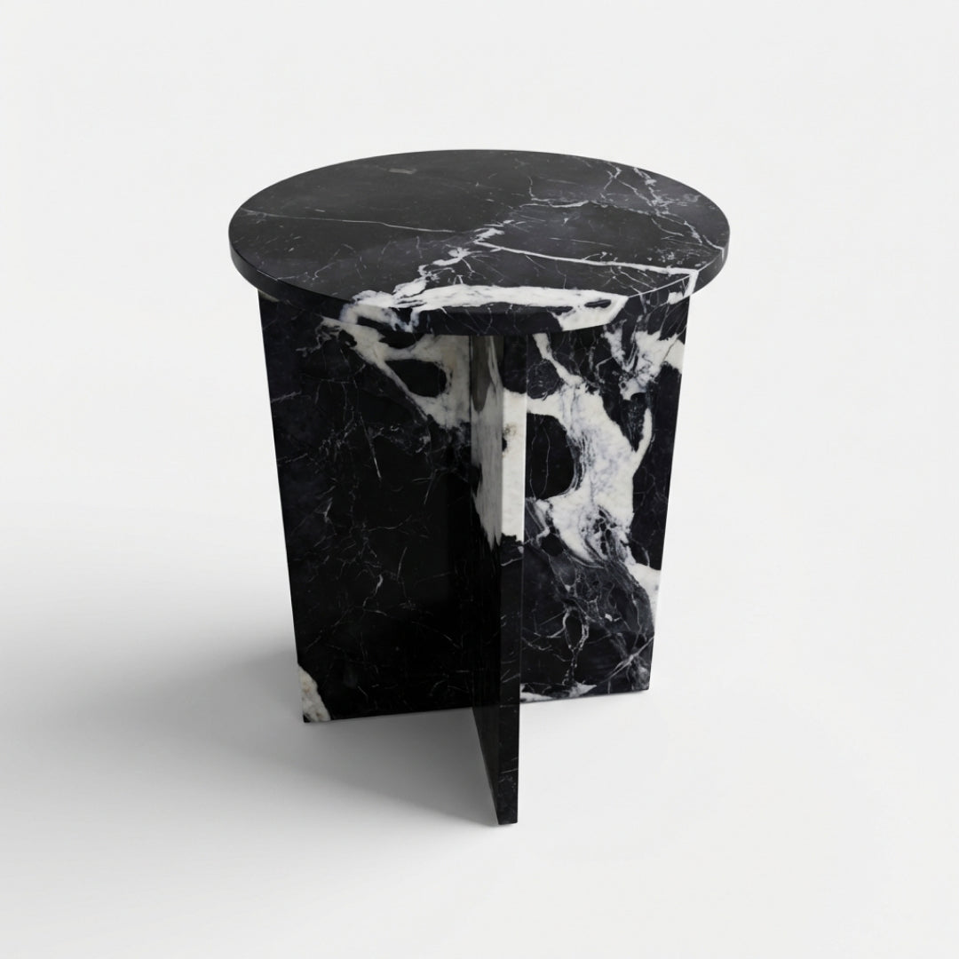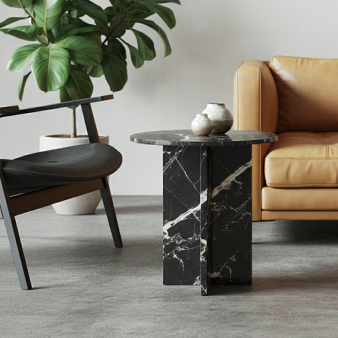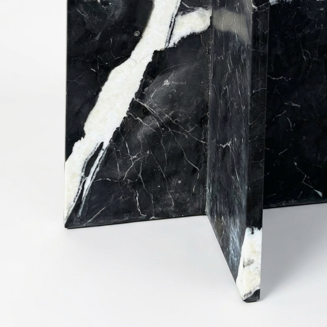The Luna Black Marble Table is a bold expression in black onyx — where crisp geometry meets the drama of natural stone. A round top rests on an intersecting cross base, letting the strong lines contrast beautifully with soft veining in chalky white.
