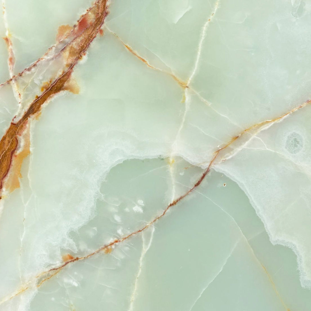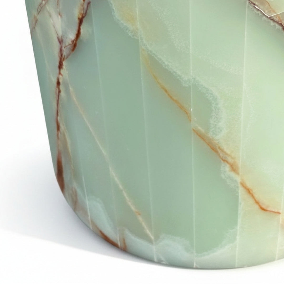 The Norah-May Table is carved from pale green onyx, where delicate veining in blush and amber moves gently across the surface. Its round top and cylindrical base offer a calm, sculptural form — simple in shape, rich in detail.